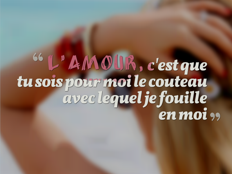 L’amour, c’est attendre quelqu’un depuis toujours… une aventure, c’est attendre quelqu’un seulement depuis qu’on le connaît. [ Mentir y’a qu’ça d’vrai ] Touzalin Jérôme 30. Il n’y a qu’un remède à l’amour: aimer davantage. [ Journaux (1905) ] Henry David Thoreau 31. L’amour est un feu qui s’éteint s’il ne s’augmente. Stendhal 32. L’amour est le miracle de la civilisation. Stendhal 33. Il suffit d’un très petit degré d’espérance pour causer la naissance de l’amour. Stendhal 34. Un peu d’amour, c’est comme un peu de bon vin… Trop de l’un ou trop de l’autre rendent un homme malade. [ Tortilla Flat, 15 ] John Steinbeck 35. Mes amours? Je me suis éprise. Je me suis méprise. Je me suis reprise. Cécile Sorel 36.