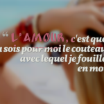 Un amour véritable – S’attache seulement à ce qu’il voit aimable. [ L’Illusion ] Corneille Pierre 168. Ecrire est un acte d’amour. S’il ne l’est pas, il n’est qu’écriture. Jean Cocteau 169. Le meilleur moment de l’amour, c’est quand on monte l’escalier. Georges Clemenceau 170. Une certaine idée de l’amour est une preuve de civilisation raffinée, comme la belle prose. Jacques Chardonne 171. L’amour, c’est beaucoup plus que l’amour. [ L’Amour, c’est beaucoup plus que l’amour (1937) ] Jacques Chardonne 172. Il faut beaucoup d’années pour apprendre certains mots d’amour. Jacques Chardonne 173. Un homme amoureux est un homme qui veut être plus aimable qu’il ne peut; et voilà pourquoi tous les amoureux sont ridicules. [ Maximes et Pensées ] Sébastien Roch, dit Nicolas de Chamfort 174.