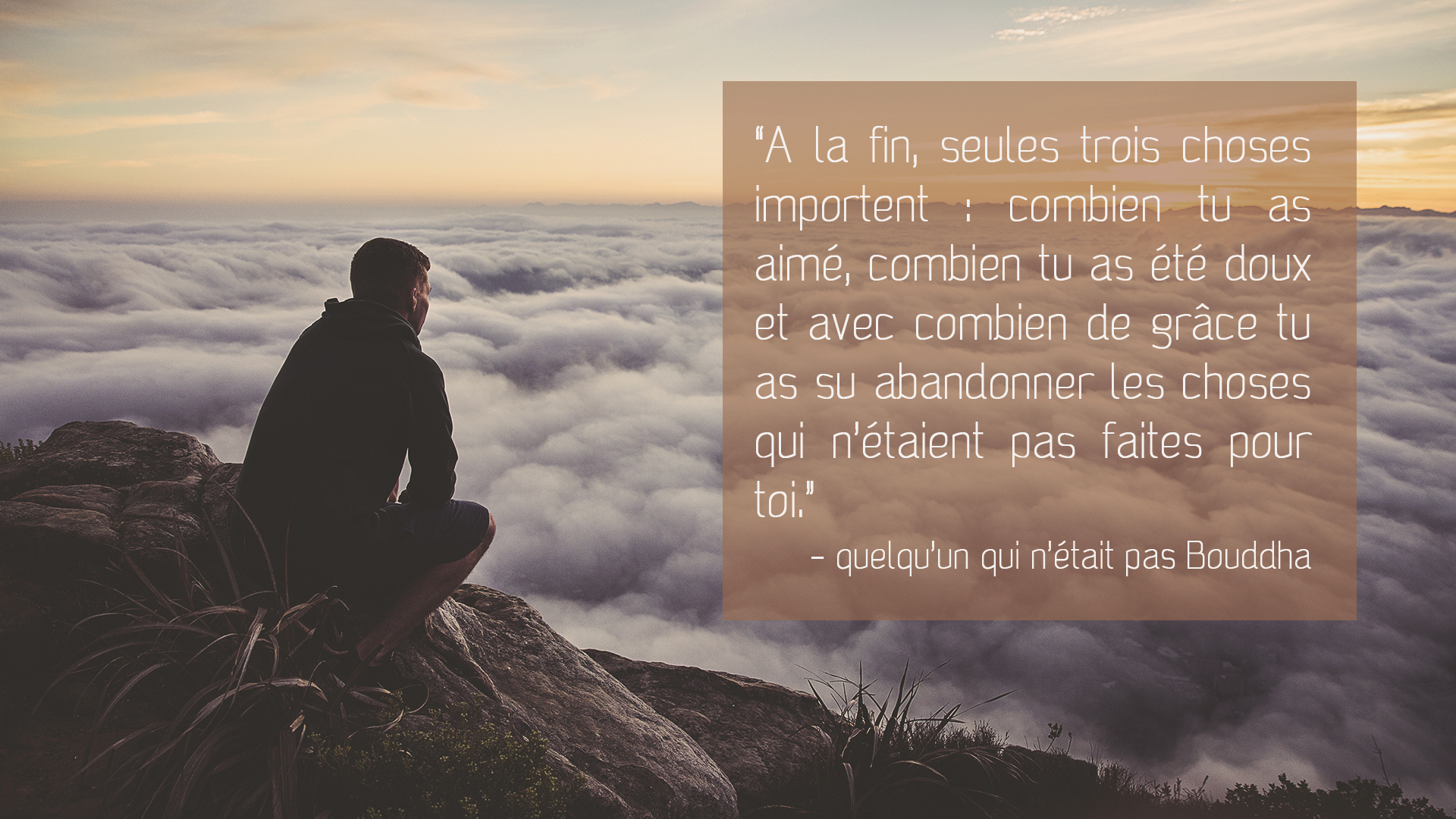 Dans la vie, nous ne pouvons échapper au changement ou à la perte. La liberté et le bonheur sont à la mesure de la souplesse et de l’aisance avec lesquelles nous accueillons le changement. Imagine que chaque individu dans l’univers est éveillé, sauf toi. Tous sont tes maîtres et font exactement ce qu’il faut pour t’aider à apprendre la patience, la parfaite sagesse, la parfaite compassion. (Le Petit Manuel du Bouddha de Jack Kornfield, p90) À des degrés divers nous sommes tous des aveugles, guidés par des aveugles, qui guidons des aveugles. Et pourquoi un aveugle ne pourrait-il en guider un autre ?