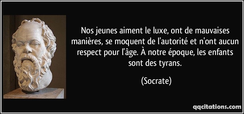 Nos jeunes aiment le luxe, ont de mauvaises manières, se moquent de l’autorité et n’ont aucun respect pour l’âge. À notre époque, les enfants sont des tyrans. 5) Citations de Socrate sur l’ intégrité Il vaut mieux obéir aux lois qu’aux hommes. (Les sentences et adages) La première clé de la grandeur est d’être en réalité ce que nous semblons être. Vous pouvez cacher aux autres une action répréhensible, mais jamais à vous-même. Quel est le moyen d’acquérir une bonne réputation ? C’est de se rendre tel que l’on veut paraître. Ce que tu veux me dire, est-ce vrai ? Est-ce bien ? Est-ce utile ? Sinon, je ne veux pas l’entendre.