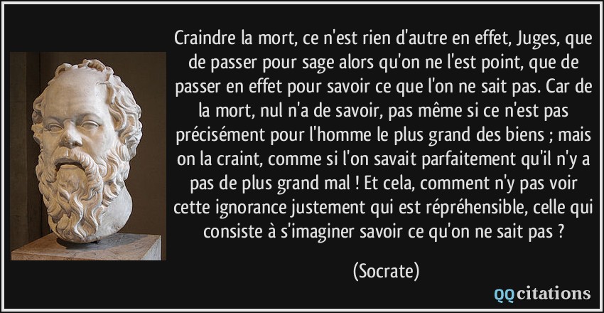 Socrate ; Les sentences et adages – Ve s. av. J.-C. L’homme doit apprendre avant tout les moyens de faire le bien et d’éviter le mal. Socrate ; Les sentences et adages – Ve s. av. J.-C. L’amour seul connaît le secret de s’enrichir en donnant. Socrate ; Le monde grec – Ve s. av. J.-C. Les peines de la vie doivent nous consoler de la mort. Socrate ; Les discours de morale – Ve s. av. J.-C. La superstition suit l’orgueil, et lui obéit comme à son père. Socrate ; Les discours de morale – Ve s. av. J.-C. La mort n’est qu’un épouvantail. Socrate ; Les discours de morale – Ve s. av. J.-C. Rien n’est trop difficile pour la jeunesse. Socrate ; Les discours de morale – Ve s. av. J.-C.