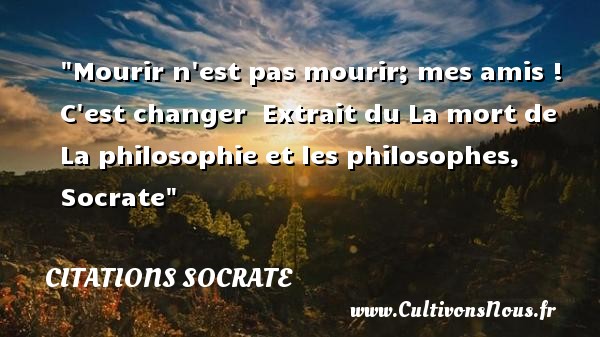 Socrate ; Les discours de morale – Ve s. av. J.-C. La mort n’est qu’un épouvantail. Socrate ; Les discours de morale – Ve s. av. J.-C. Rien n’est trop difficile pour la jeunesse. Socrate ; Les discours de morale – Ve s. av. J.-C. Le loisir est le meilleur des biens. Socrate ; Les discours de morale – Ve s. av. J.-C. Haïr et harceler la vertu, c’est abjurer tout espoir de salut. Socrate ; Le monde grec – Ve s. av. J.-C. Tout entretien sur la musique doit se terminer à l’amour du beau. Socrate ; Le monde grec – Ve s. av. J.-C. En toutes choses on doit agir dans la vue du bien. Socrate ; Le monde grec – Ve s. av. J.-C.