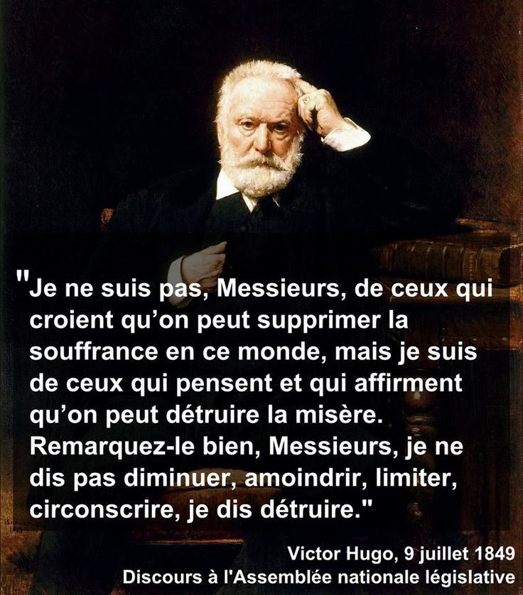 Victor Hugo ; Faits et croyances (1840) L’enfance a cela d’ineffable qu’on peut épuiser sur elle tous les amours. Victor Hugo ; Quatre-vingt-treize (1874) Un réveil d’enfants, c’est une ouverture de fleurs ; il semble qu’un parfum sorte de ces fraîches âmes. Un rayon du matin était sur son berceau ; il eût été difficile de dire quel était le plus rose, du pied de l’enfant ou de l’aurore. Victor Hugo ; Quatre-vingt-treize (1874) Dieu tombe goutte à goutte du ciel, et larme à larme de nos yeux. Victor Hugo ; Post-scriptum de ma vie (1901) Près de toi rien de moi n’est resté, et ton amour m’a fait une virginité. Victor Hugo ; Marion Delorme (1831) Pour la haine une femme vaut dix hommes.