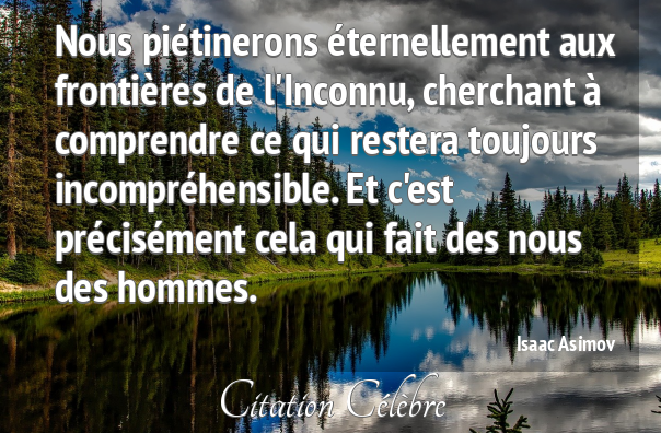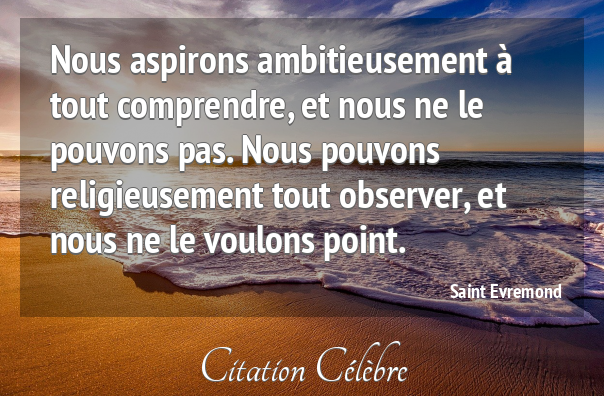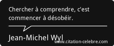 Citation de Henri-Frédéric Amiel ; Journal intime, le 5 juillet 1853. Ce qu’on ne comprend pas, on n’a pas le droit de le juger. Citation de Henri-Frédéric Amiel ; Grains de mil (1854) Ce qu’on fait n’est jamais compris mais seulement loué ou blâmé. Citation de Friedrich Nietzsche ; Le gai savoir (1882 et 1887) Ce qui est impossible à comprendre est tellement simple à vivre. Citation de Christian Bobin ; Le Très-Bas (1992) Si tu comprends autant que moi, alors c’est que t’es moins con que t’en as l’air. Citation de Raymond Queneau ; Zazie dans le métro (1959) Il n’est pas grave de ne pas comprendre les mystères de la vie. Ce qui est grave, c’est de les nier parce qu’on est trop con pour les comprendre.