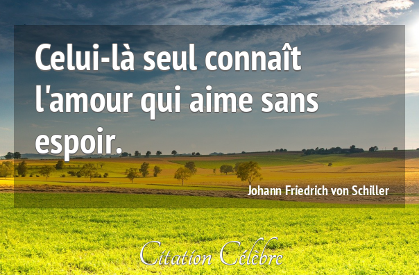 Citation de Stendhal ; De l’amour (1822) L’amour idéal, on le cherche, on le désire, on l’espère, et quand vient la mort, on le cherche encore. Citation de Clémence Robert ; Le petit livre sur l’amour (1856) Il n’est point d’amour sans espoir. Citation de Sophie Cottin ; Claire d’Albe (1798) L’amour espère, espère toujours sans se lasser jamais d’espérer. Citation de Miguel de Unamuno ; Journal intime (1989) Dans le jeune âge on aime beaucoup, parce qu’on croit beaucoup et qu’on espère ; on n’a l’expérience ni des hommes, ni des choses, ni du temps. Plus tard le cœur se resserre, parce que la foi diminue, et quand elle s’éteint tout à fait, le cœur se ferme.