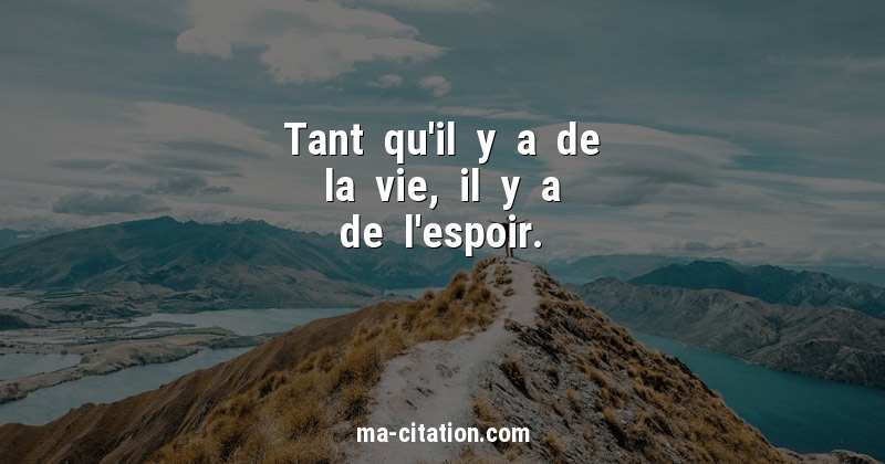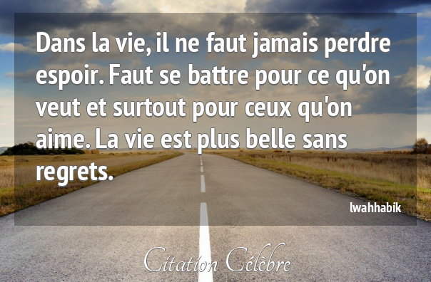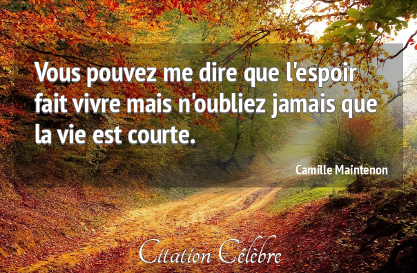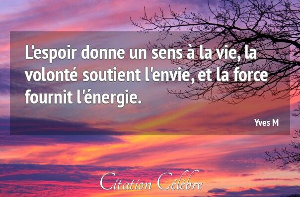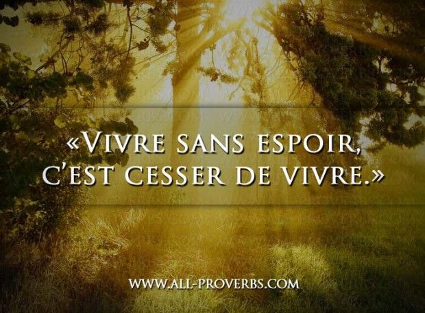 Citation de David Augustin de Brueys ; Les amusements de la raison (1721) Le trompeur espoir d’un meilleur avenir suffit seul pour calmer notre imagination et prolonger sans fin nos misères. Citation de Guillaume-Thomas Raynal ; L’histoire philosophique et politique (1770) Que faut-il à vingt ans pour être heureux ? Un rayon d’espoir. À quarante ans ? Un rayon de gloire. À soixante ans ? Un rayon de soleil. Citation de Adolphe d’Houdetot ; Dix épines pour une fleur (1853) Continue de te battre pour ce que tu crois, même si c’est parfois très difficile. Dis-toi que certaines batailles sont plus longues à gagner que d’autres, et ne perd jamais espoir. Citation de Alexandra Julien ; Le livre des pensées positives (2012) On ne doit mettre son espoir qu’en soi-même.