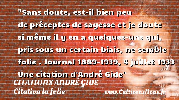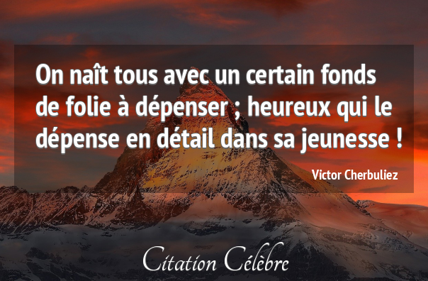 Citation de Joseph Michel Antoine Servan ; Extrait d’un portefeuille (1807) Il est des folies que même le diable ignore. Citation de Tahar Ben Jelloun ; L’enfant de sable (1985) Les grandes passions expliquent et justifient en quelque mesure les grandes folies. Citation de Victor Cherbuliez ; La ferme du Choquard (1883) Pour un psychiatre, le signe le plus probant de la folie chez un patient réside dans sa prétention à être sain d’esprit. Citation de Frédéric Dard ; Du bois dont on fait les pipes (1982) La jeunesse fera toujours beaucoup de fautes et de folies, et s’attirera les plus grands malheurs, quand elle ne consultera pas les gens sages et expérimentés, et qu’elle ne suivra pas leurs conseils.
