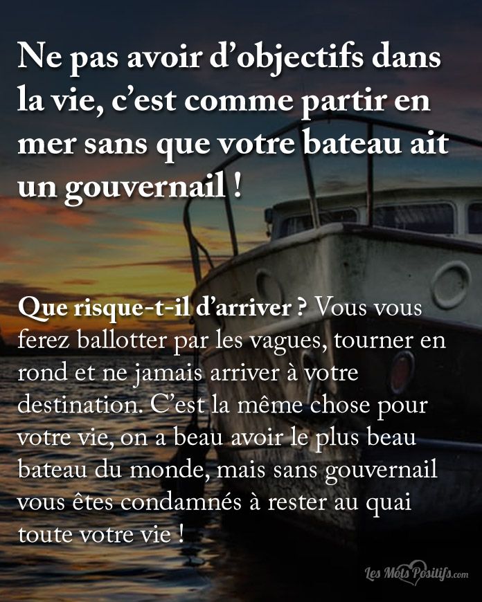 ~ Proverbe autochtone La tragédie dans la vie ne réside pas dans ne pas atteindre votre objectif. La tragédie est de n’avoir aucun but à atteindre. ~ Benjamin Mays 2) Citations sur bien choisir nos objectifs : Un objectif correctement défini est à moitié atteint. ~ Anonyme En atteignant notre but, est-ce qu’on néglige l’essentiel ? ~ Anonyme Ce n’est pas d’où vous venez qui compte, mais où vous allez. ~ Ella Fitzgerald Il est plus important de bien choisir ses objectifs que de les atteindre. ~ Anonyme Fixez-vous des objectifs élevés, et ne vous arrêtez pas avant d’y être arrivé. ~ Bo Jackson Ne fixe pas tes buts en fonction des autres. Toi seul sais ce qui est bon pour toi.