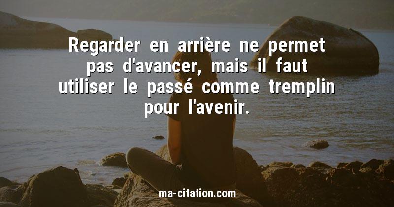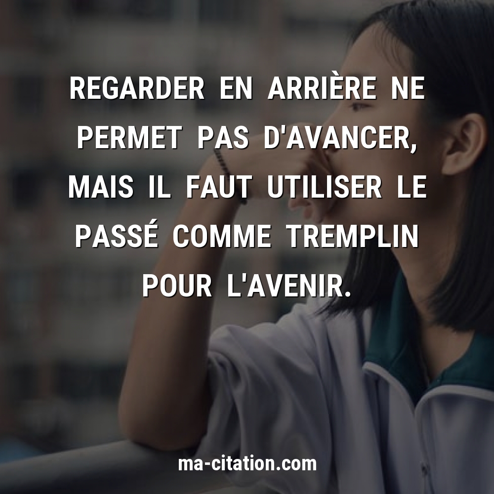 Parce que ton passé n’est pas aussi important que ton avenir, donc regarde vers l’avenir et garde un oeil sur ton passé. Citations 7) : Préparer notre avenir L’avenir ne se prévoit pas, il se prépare. Maurice Blondel Profite du présent tout en préparant bien l’avenir. Et Laisse le passé aux morts. Le meilleur moyen de prédire votre avenir, c’est de le créer. Abraham Lincoln Il y a l’avenir qui se fait et l’avenir qu’on fait. L’avenir réel se compose des deux. Alain Votre avenir est la concrétisation de ce que vous avez pensé auparavant. Joseph Murphy Pour chaque regard que nous jetons en arrière, il nous faut regarder deux fois vers l’avenir. La puissance naît d’un présent conscient et pleinement vécu, utilisé pour agir et créer votre futur. L’avenir n’est jamais que du présent à mettre en ordre.
