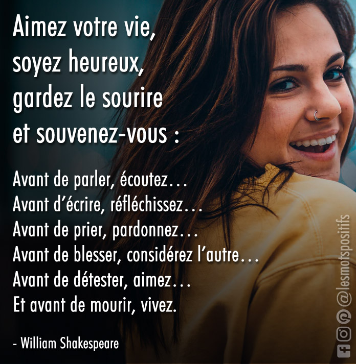 Citation de Jacques Salomé ; Bonjour tendresse (1992) La vie est une marâtre ; combien de sourires avez-vous vu passer sur ses lèvres d’airain ! Citation de Victor Cherbuliez ; Le comte Kostia (1863) Il y a un sourire de l’homme qui a pris depuis longtemps le parti de faire beaucoup de bien et beaucoup d’ingrats. Citation de Victor Cherbuliez ; Les pensées extraites de ses œuvres (1913) Une bouche souriante et fraîche aux dents de perle appelle l’abeille de l’amour. Citation de Henri-Frédéric Amiel ; Journal intime, le 9 juillet 1851. Il y a des sourires qui ne sont que mensonge, art ou science, mais perfection dans la dissimulation. Citation de Stefan Zweig ; Amok ou Le fou de Malaisie (1922) Quand tu donnes, donne avec joie et en souriant.