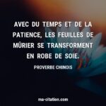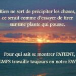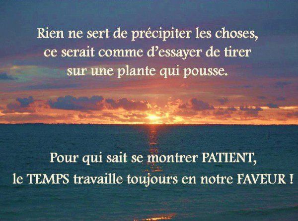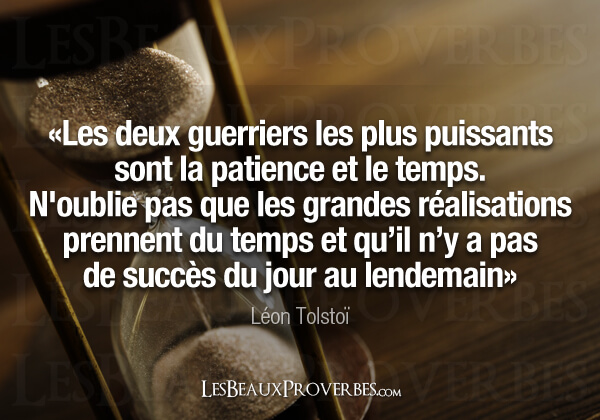 Pratiquer la patience est la manière la plus efficace de préserver la paix de l’esprit. ~ Anonyme Apprenez l’art de la patience. Appliquez de la discipline à vos pensées lorsqu’elles s’inquiètent du résultat d’un objectif. L’impatience engendre l’anxiété, la peur, le découragement et l’échec. La patience crée la confiance, la détermination et une perspective rationnelle, ce qui mène finalement au succès. ~ Brian Adams 5) Citations sur : Le bon moment Tout vient à point à qui sait attendre. ~ Proverbe français Avec de la patience, le raisin finit par devenir sucré. ~ Proverbe kurde Tout ce que nous avons fait ne sera pas perdu à tout jamais, tout mûrit à temps et devient fruit à son heure.
