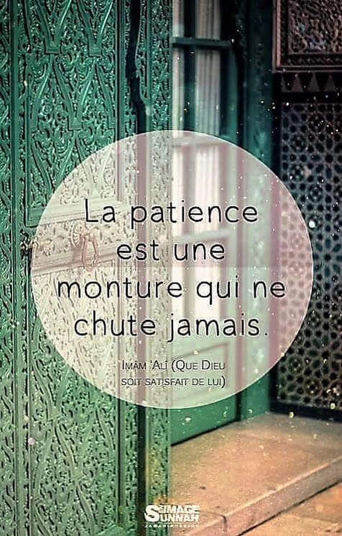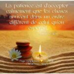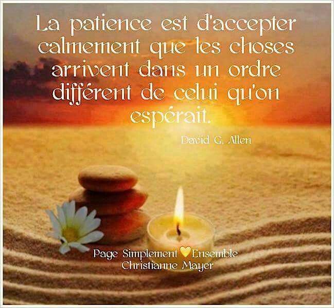 Proverbe latin La ruse de qui est sans ruse, c’est la patience. Proverbe arabe N’est point patient qui veut. Proverbe français La patience est la clé du paradis Proverbe turc La patience est la seconde bravoure de l’homme. Proverbe espagnol La patience moissonne la paix, et la hâte le regret. Proverbe arabe Dieu est avec les patients. Proverbe arabe La patience a beaucoup plus de pouvoir que la force. Citation de Plutarque La patience est une vertu qui s’acquiert avec de la patience. Citation d’Alessandro Morandotti Patience ! Avec le temps, l’herbe devient du lait. Proverbe chinois On vient à bout de ses desseins avec la patience. Proverbe oriental L’amour se nourrit de patience autant que de désir.
