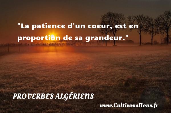 Citation de Louis Belmontet ; Les pensées, maximes et proverbes poétiques (1861) La patience sait toujours trouver le mot de la fin. Citation de Victor Cherbuliez ; Les amours fragiles (1880) Supporter avec patience les défauts des autres est le seul moyen de n’en souffrir que peu ou même point du tout. Citation de Félicité de Genlis ; Les pensées et maximes détachées (1801) On a rarement de la patience de reste, mais il suffit d’en avoir assez. Citation de Anne Barratin ; De toutes les paroisses (1913) Sans s’effrayer de sa longue route, la patience peut la trouver longue. Citation de Anne Barratin ; De toutes les paroisses (1913) Il est quelquefois difficile de distinguer entre l’indolence et la patience.