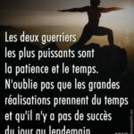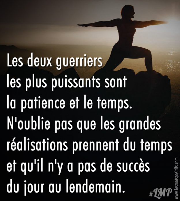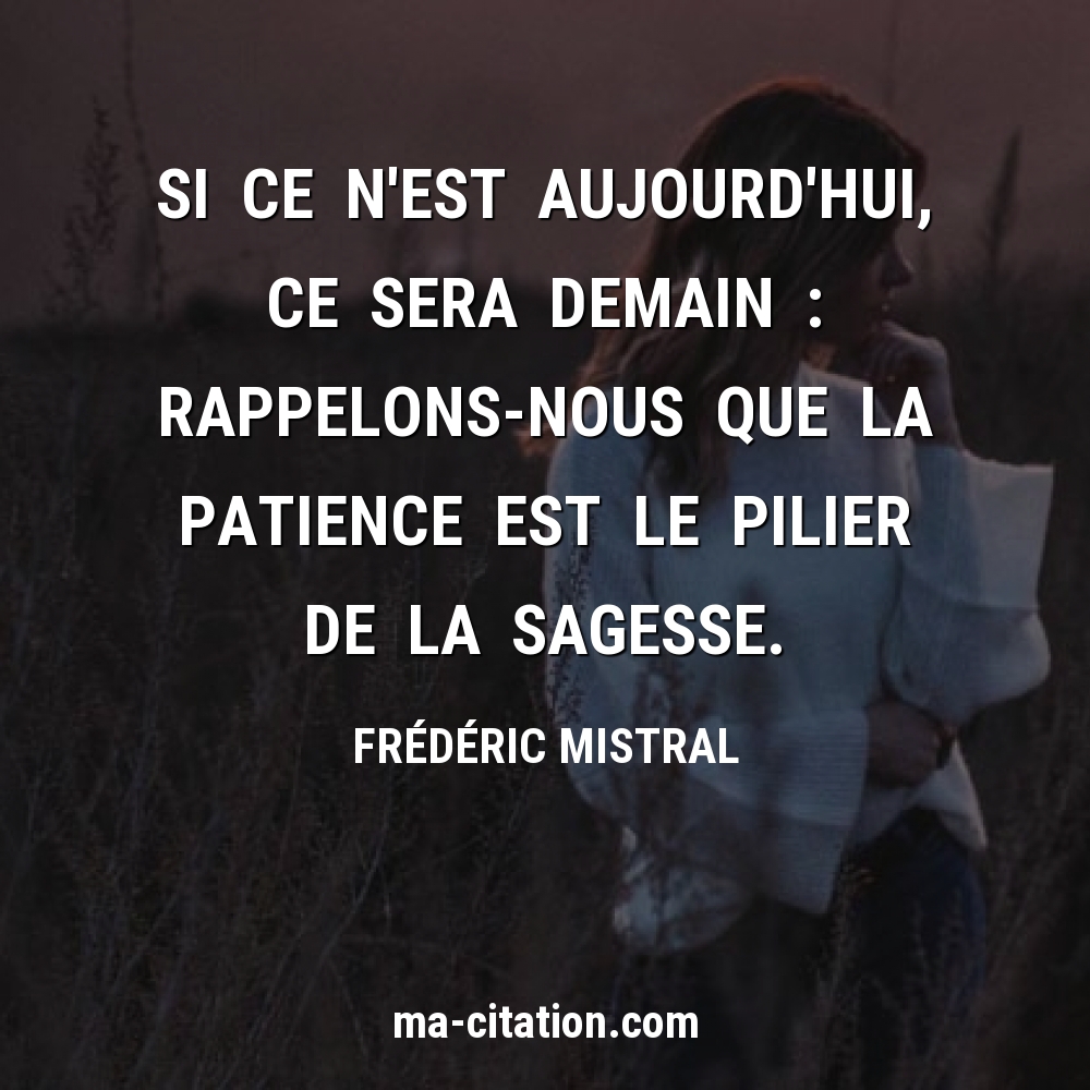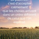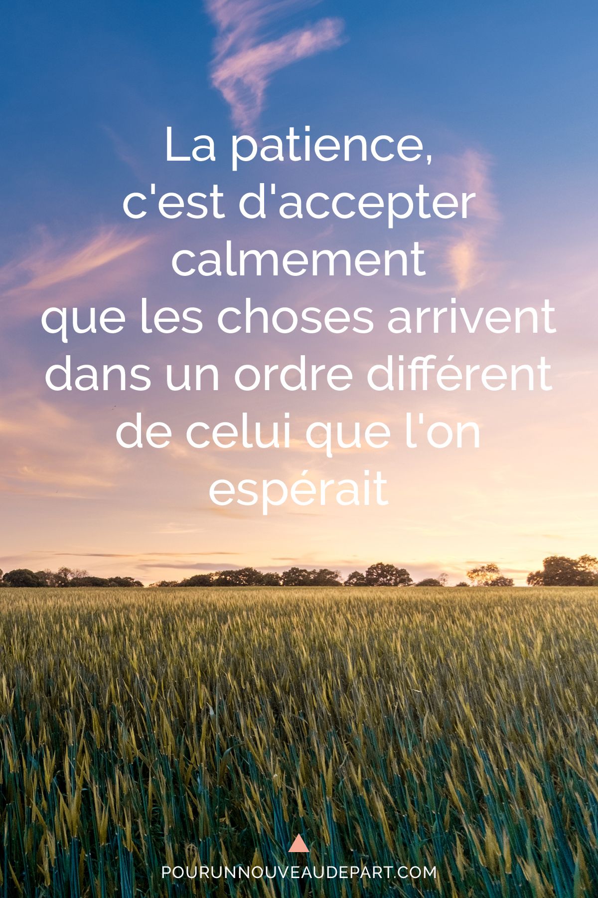 Citation de Alfred Auguste Pilavoine ; Les pensées, mélanges et poésies (1845) Il n’y a rien dont ne triomphe un peu de patience. Citation de Molière ; La princesse d’Élide (1664) La patience a le succès en retour de l’attente. Citation de Pierre-Claude-Victor Boiste ; Le dictionnaire universel (1800) La fermeté et la patience sont deux grands secours dans les évènements de la vie : elles triomphent des circonstances, ou elles mettent à l’abri des coups de la fortune. Citation de Charles-Jean Baptiste Bonnin ; La doctrine sociale (1820) Puisqu’on est destiné à vivre avec les hommes et à souffrir d’eux, on ne saurait trop s’appliquer à acquérir de la douceur et de la patience, à réprimer nos accès de vivacité et de colère. Citation de Jean-Baptiste Blanchard ; L’école des mœurs (1772)