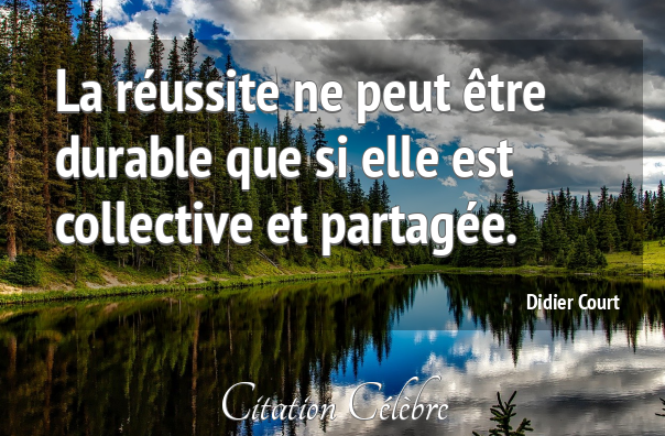 Citation de Marcelle Auclair ; La pratique du bonheur (1956) Notre réussite a besoin de flatter ceux qui nous sont chers pour nous être très doux. Citation de Anne Barratin ; Chemin faisant (1894) La réussite des autres doit donner de l’espoir à ceux qui n’ont pas réussi. Citation de Jean Dutourd ; Le fond et la forme (1958) Une belle âme reste belle dans les pires difficultés. Une âme moche trouve le moyen de montrer sa mocheté au milieu des réussites les plus persévérantes. Citation de Jean Dutourd ; Les œuvres romanesques (1979) Savoir se montrer fort, c’est pour une large part, assurer réussite.