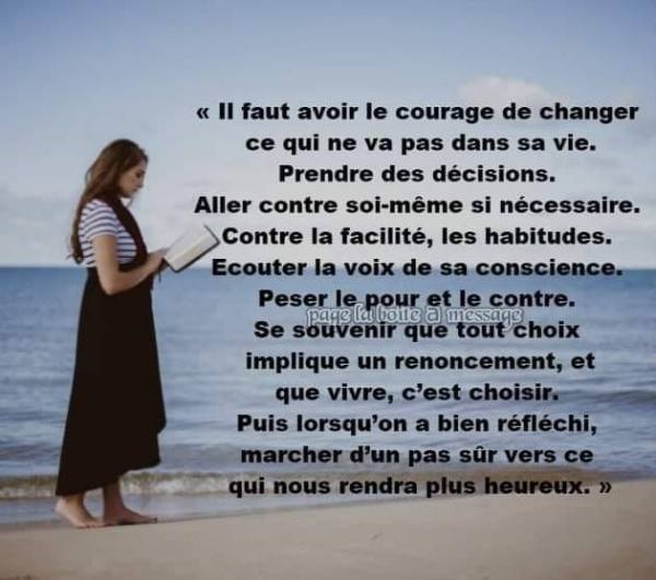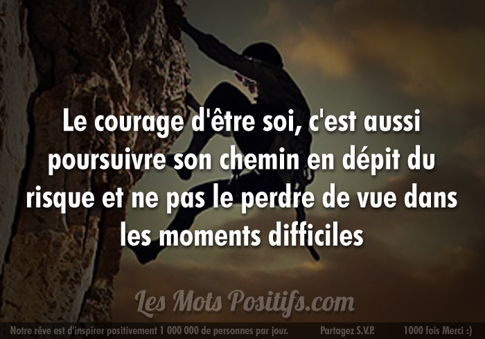~ Publilius Syrus (Sentences) Si tu as envie d’abandonner, regarde d’où tu es parti. ~ Anonyme On peut toujours abandonner, alors pourquoi le faire maintenant ? ~ Robert T. Kiyosaki Quand tu as envie d’abandonner, pense à la raison qui t’a fait commencer. ~ Anonyme Le courage te permet de courir ta propre course. Le courage te permet de faire tout ce que tu veux parce que tu sais que c’est juste. Le courage te donne la maîtrise de toi-même pour persister là où les autres ont abandonné. ~ Robin S. Sharma 11) Citations sur la vie et le courage : Le courage est le prix que la vie exige pour accorder la paix. ~ Amelia Earhart Comment serait votre vie si vous n’aviez pas le courage de tenter des choses ?