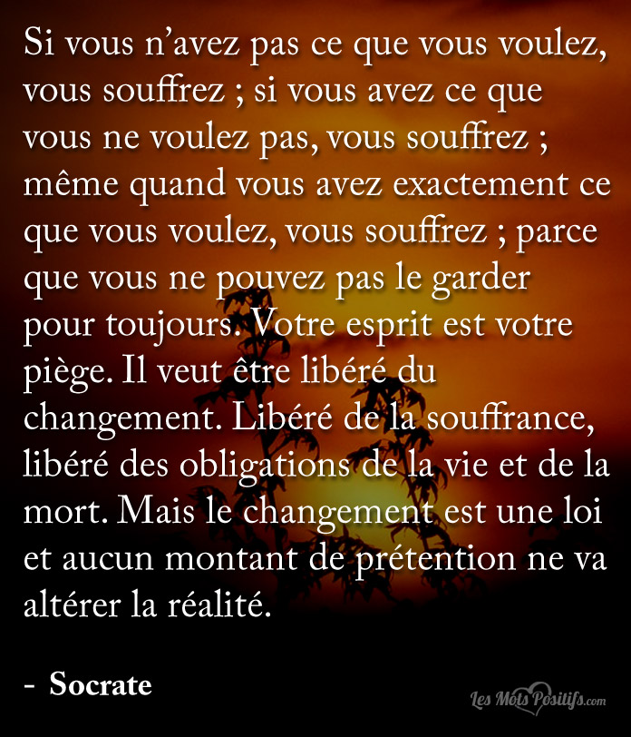1) Citations de Socrate sur l’ amour L’amour seul connaît le secret de s’enrichir en donnant. Que voulez-vous que je lui apprenne ? Il ne m’aime pas. On obtiendra l’amitié d’un homme en cultivant en soi les qualités qu’il estime en lui. Il n’est pas de bien plus précieux qu’un excellent ami ; il n’en est aucun dont on tire plus de profit, ni qui donne plus de plaisir. 2) Citations de Socrate sur le bonheur Le bonheur, c’est le plaisir sans remords. Beaucoup pensent à vivre longtemps, peu à bien vivre. Ce n’est pas la vie, mais une bonne vie qu’il faut apprécier en premier. Tous les événements sont enchaînés dans le meilleur des mondes possibles. Soyez heureux, agissez dans le bonheur, sentez-vous heureux, sans aucune raison.