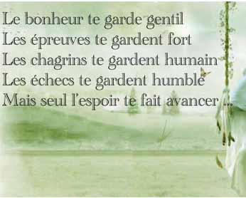 L’espoir, fleur du chagrin qui promet un beau fruit, s’entrouvre autant de fois qu’un vent froid le détruit. Citation de Louis Belmontet ; Les pensées, maximes et proverbes poétiques (1861) La vie se passe entre l’espoir et le doute. Citation de Marie-Thérèse Rodet Geoffrin ; Les maximes et pensées (1699-1777) La déception est souvent le fruit d’un espoir surévalué. Citation de Grégoire Lacroix ; Les euphorismes de Grégoire, Tome 3 (2017) Mieux qu’un espoir ? Une décision. Citation de Grégoire Lacroix ; Les euphorismes de Grégoire (2006) Reprenez espoir et courage, il est peu de maux qui soient sans remède.