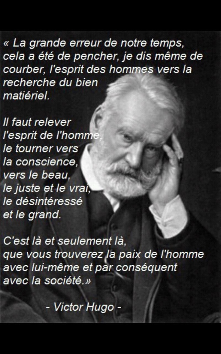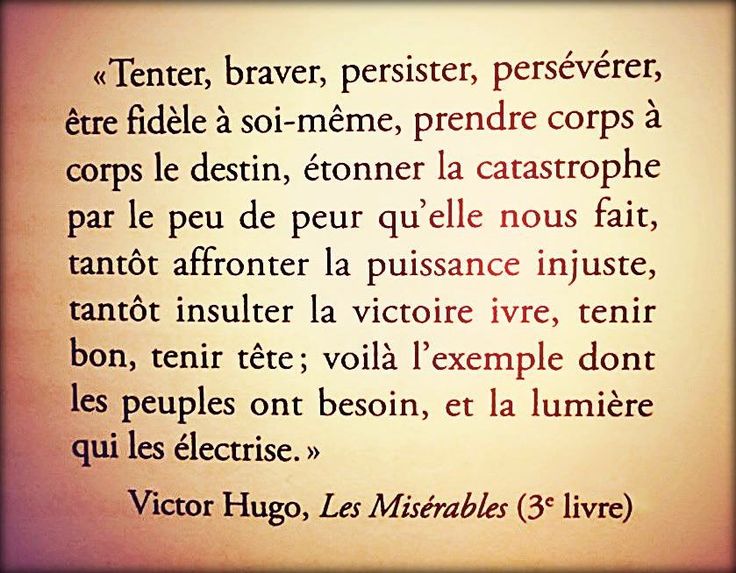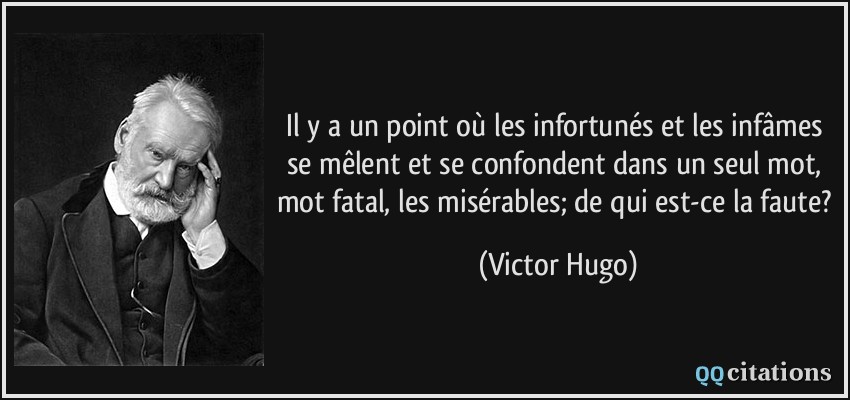 Victor Hugo ; Les misérables (1862) L’amour a des enfantillages, les autres passions ont des petitesses. Victor Hugo ; Les misérables (1862) Vous qui souffrez parce que vous aimez, aimez plus encore : mourir d’amour, c’est en vivre. Victor Hugo ; Les misérables (1862) L’amour est une respiration céleste de l’air du paradis. Victor Hugo ; Les misérables (1862) Le suprême bonheur de la vie, c’est la conviction qu’on est aimé. Victor Hugo ; Les misérables (1862) Le plus beau des autels, c’est l’âme d’un malheureux consolé qui remercie Dieu. Victor Hugo ; Les misérables (1862) L’indifférence de ces penseurs, c’est là, selon quelques-uns, une philosophie supérieure. Victor Hugo ; Les misérables (1862) Le premier symptôme de l’amour vrai chez un jeune homme c’est la timidité, chez une jeune fille c’est la hardiesse.