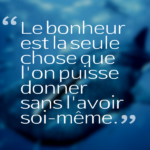 J’espère que pour le coup, vous apprécierez ma sélection, n’hésitez pas comme toujours me laisser à petit commentaire pour partager vos opinions. à très vite dans un prochain article! Citations de Bonheur : Le bonheur est comme un papillon: il vole sans jamais regarder en arrière. ~Robert Lalonde Il ne faut pas attendre d’être parfait pour commencer quelque chose de bien ~Abbé Pierre Tourne-toi vers le soleil, et l’ombre sera derrière toi!~ Proverbe Maori Ne mettez jamais la clé de votre bonheur dans la poche de quelqu’un d’autre.~ Aimer, c’est donner rendez-vous au bonheur dans le palais du hasard.~Abel Bonnard Le bonheur c’est de continuer à désirer ce qu’on possède.
