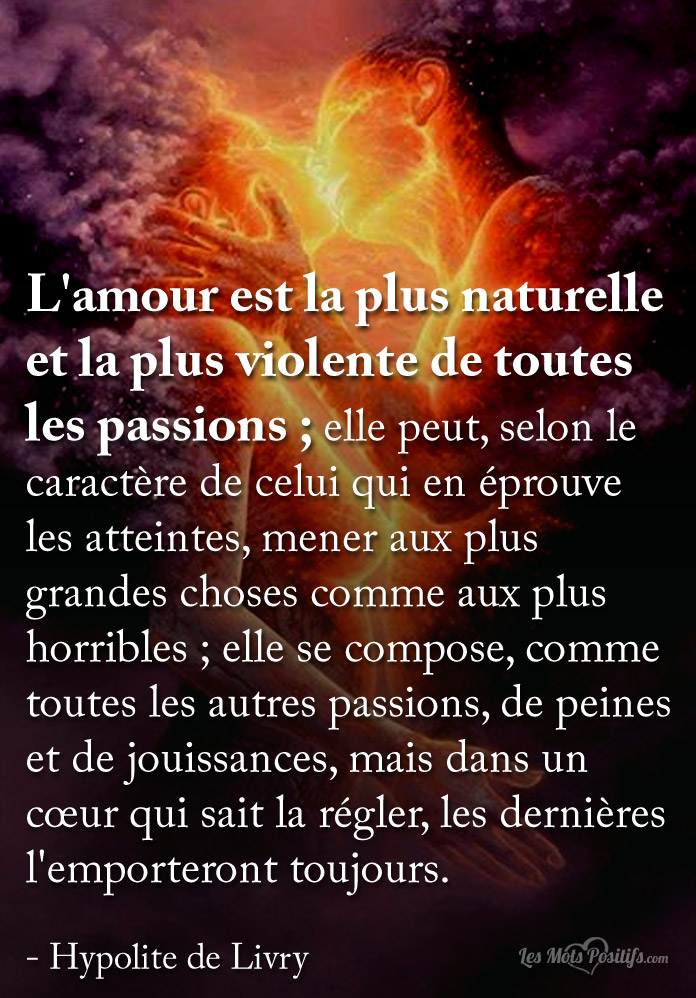 L’amour véritable: un réseau de liens qui fait devenir. [ Pilote de guerre (1942) ] Antoine de Saint-Exupéry 45. Je ne dirai pas les raisons que tu as de m’aimer. Car tu n’en as point. La raison d’aimer, c’est l’amour. [ Citadelle (1948) ] Antoine de Saint-Exupéry 46. Nous ne voulons pas de richesses. Nous voulons la paix et l’amour. Sagesse indienne 47. L’amour a un caractère si particulier qu’on ne peut le cacher où il est, ni le feindre où il n’est pas. [ Maximes (1678), 80 ] Madeleine de Souvré marquise de Sablé 48. Un seul amour, ce n’est pas assez. Deux amours, c’est trop. [ Le livre de la déraison souriante (1991) ] Robert Sabatier 49. Une femme est une spécialiste de l’amour. Un homme, un simple généraliste.