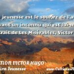 Citation de Alexandre Dumas, fils ; Un cas de rupture (1854) Les soupçons ne sont autre chose que des rides, la première jeunesse n’en a pas. Citation de Victor Hugo ; Les misérables (1862) La jeunesse a des besoins de dépense comme l’oiseau des besoins d’aile. Citation de Anne Barratin ; Chemin faisant (1894) J’ai vécu toute ma jeunesse avec l’idée de mon innocence, c’est-à-dire avec pas d’idée du tout. Citation de Albert Camus ; Les carnets II (janvier 1942/mars 1951) Le bonheur de la jeunesse égaie la vie comme le soleil du matin égaie la journée.