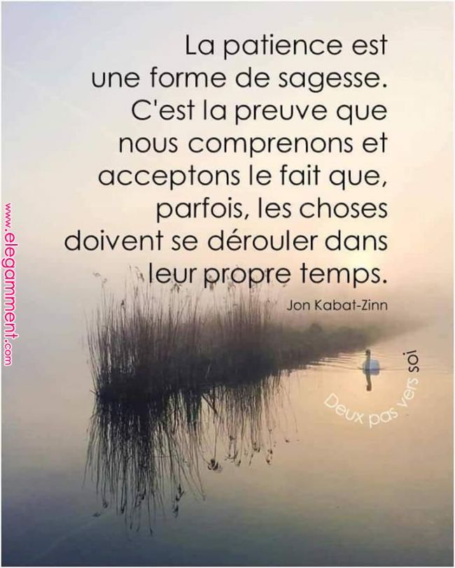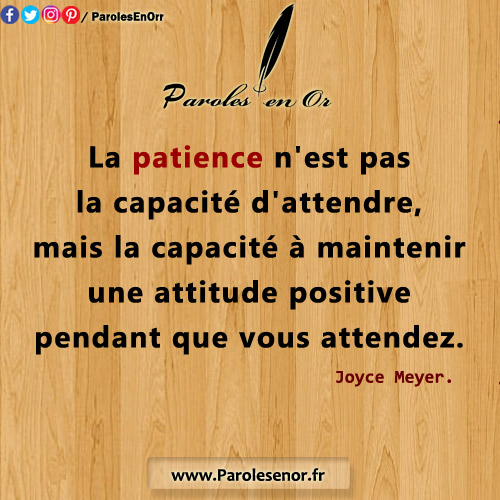 Citation de Anne Barratin ; De toutes les paroisses (1913) Sans s’effrayer de sa longue route, la patience peut la trouver longue. Citation de Anne Barratin ; De toutes les paroisses (1913) Il est quelquefois difficile de distinguer entre l’indolence et la patience. Citation de Antoine Claude Gabriel Jobert ; Le trésor de pensées (1852) On arrive à faire de belles choses à force de patience et de longue énergie. Citation de Gustave Flaubert ; Lettre à Louise Colet, le 13 décembre 1846. La patience marche de triomphe en triomphe. Citation de Jean-Louis Moré ; Le petit livre pour le premier âge (1840) La patience est une vertu qui porte toujours sa récompense avec elle.