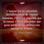 Un homme amoureux, qui plaint l’homme raisonnable, me paraît ressembler à un homme qui lit des contes de fées, et qui raille ceux qui lisent l’histoire. Sébastien-Roch Nicolas de Chamfort 266. Parler d’amour, c’est faire l’amour. Honoré de Balzac 267. Le premier symptôme de l’amour vrai chez un jeune homme c’est la timidité, chez une jeune fille c’est la hardiesse. Victor Hugo 268. Il y a dans l’acte d’amour une grande ressemblance avec la torture ou avec une opération chirurgicale. Charles Baudelaire 269. L’amour craint le doute, cependant il grandit par le doute et périt souvent de la certitude. Gustave Le Bon 270. Aimer, c’est trouver sa richesse hors de soi. Alain 271. Combien peu d’amours trouvent en elles-mêmes assez de force pour demeurer sédentaires ! François Mauriac 272.