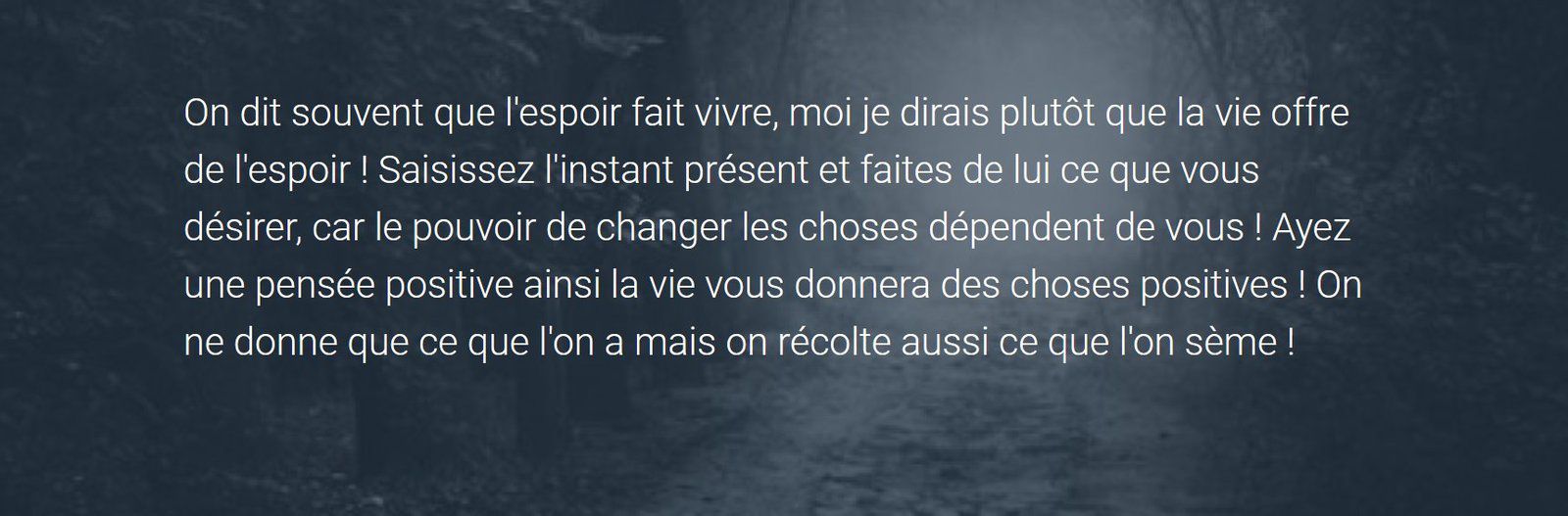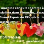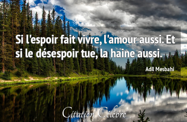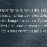 ~ Omraam Mikhaël Aïvanhov C’est quoi une vie d’homme ? C’est le combat de l’ombre et de la lumière… C’est une lutte entre l’espoir et le désespoir, entre la lucidité et la ferveur… Je suis du côté de l’espérance, mais d’une espérance conquise, lucide, hors de toute naïveté. ~ Aimé Césaire (Entretien dans Présence africaine) Vous ne savez pas encore ce qu’est l’espérance. L’espérance est une sagesse qui sait utiliser le passé et le présent pour agir sur l’avenir. L’espérance, c’est de pouvoir vivre une réalité magnifique qui ne s’est pas encore actualisée dans le plan physique. ~ Omraam Mikhaël Aïvanhov (29 mai 2021) Citations : 10) Sentiments et espoir L’amour sans l’espoir devient une chose morte. ~ Alain Grandbois L’espoir, malgré moi, s’est glissé dans mon cœur.