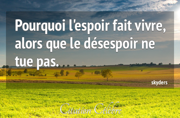 L’espoir empêche bien des hommes de se pendre. Citation de Ovide ; Epistulea ex Ponto, I, VI, 39 – env. 5 ap. J.-C. N’entretiens pas l’espoir de ce qui ne peut être espéré. Citation de Pythagore ; Les vers d’or – VIe s. av. J.-C. Quand on a mal agi, on perd jusqu’à l’espoir qui donne du courage. Citation de Sophocle ; Les Trachiniennes – Ve s. av. J.-C. L’espoir d’une meilleure existence future nous console de la présente. Citation de François-Rodolphe Weiss ; Les principes philosophiques et moraux (1785) L’homme charme ses ennuis présents par l’espoir d’un avenir chimérique. Citation de Jean-Baptiste Massillon ; Les maximes et pensées (1742) Quant on a tout perdu, quand on n’a plus d’espoir, la vie est un opprobre et la mort un devoir.