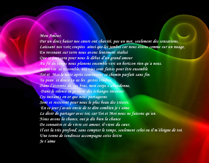 Lettre d’amour pour un homme lorsque vous vous sentez d’humeur romantique Mon amour, mon coeur, mon âme soeur, Si tu te demandes à quel point je t’aime, plus besoin de te poser des questions car voici la réponse. Tu es le soleil de ma journée, la rivière qui coule le long de mes veines et l’air que je respire. Avant de te rencontrer, je ne pensais pas qu’il était possible d’aimer quelqu’un de façon aussi sincère, pure et profonde. Mais, tu m’as donné la foi et j’ai compris que le véritable amour existe car je le partage avec toi. Je t’aime de tout mon coeur, de toute mon âme et de tout mon corps. Tu es mon prince charmant, mon âme soeur et mon meilleur ami. Je suis complètement tienne.