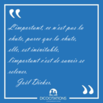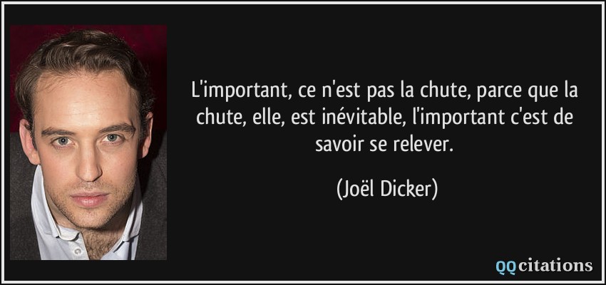 Pourtant la chute n’est rien, car l’échec peut devenir le billet pour un nouveau départ, à condition d’en tirer le meilleur. Vous êtes tombés ? Relevez vous ! La chute n’est pas un échec, l’échec est de rester là où nous sommes tombés. Socrate Qui n’a jamais connu l’échec ? C’est par la capacité à rebondir et à corriger le tir la fois suivante que l’échec devient utile et formateur. Ne pas atteindre l’objectif est ressenti comme une chute, une sensation d’effondrement, de vide. Mais la vie est une succession de chutes, à commencer par les premières chutes quand on apprend à marcher. Quand on tombe au fond du gouffre, pourquoi regarder ses pieds ? Il faut lever la tête pour rechercher la lumière et une issue de secours?