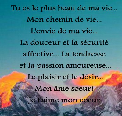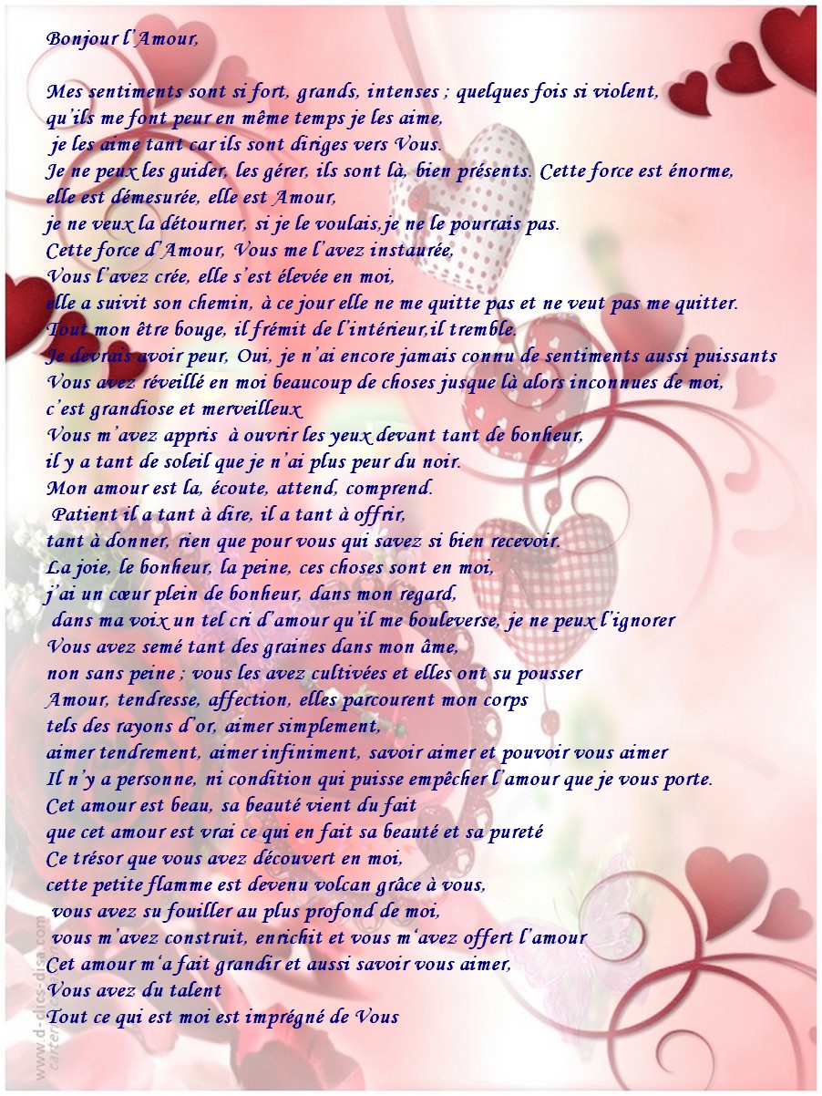 Parole d’amour pour mon chéri Mon amour pour toi, chaque jour, sort de l’ordinaire Tous mes sens, subisse ton charme Tu me rends folle avec ton simple sourire Dans ma vie, tu as fait entrer le Soleil… Parole d’amour je t’aime T’aimer, c’est avoir besoin de toi et supporter tes défauts, parce que d’une certaine manière, tu me complètes. jtm. Parole d’amour je pense à toi Je pense à toi tout le temps, je n’ai même pas besoin de penser à toi pour que tu me viennes à l’esprit, tu es tout le temps avec moi comme un ange, un soleil, une présence, un grand espoir. Je t’aime. Parole d’amour pour un homme Ils peuvent me mettre des chaînes, me brisez les doigts.
