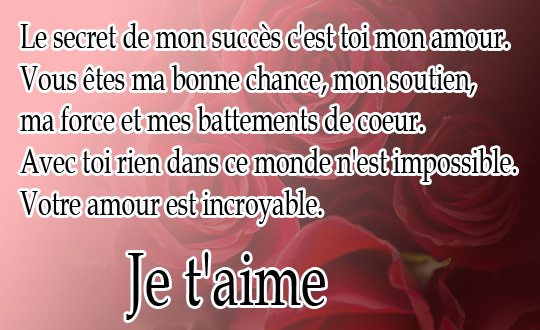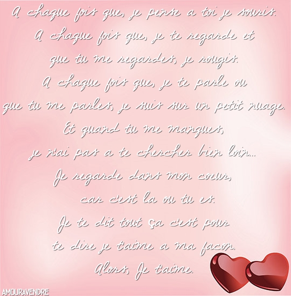 touchant pour une femme, texte touchant pour un homme · Si tu étais une larme au coin de mon œil, je n’oserais pas pleurer de peur de te perdre. · J’aimerai de mes doigts, avec le fil de mon amour, broder sur ta peau, l’image de ma passion. Je t’aime.mon homme. · Je t’aime toi, à l’infini et bien plus encore et pour toujours, c’est promis. · Je t’envoie beaucoup d’amour et de joie à toi, ma chérie, en ce jour où mon cœur ne recherche que ton bonheur. · Même si tu te défends à coups d’épines, tu resteras toujours la reine des fleurs. · Ne crois pas que mon coeur puisse t’oublier, il peut cesser de battre mais pas de t’aimer.