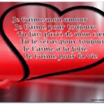 Parole d’amour pour lui Aimer, c’est d’avoir quelqu’un de spécial Sur qui vous pouvez toujours compter d’être là au fil des ans de partager les rires et les larmes en tant que partenaire, c’est ça l’amour. Parole d’amour pour mon chéri Mon amour pour toi, chaque jour, sort de l’ordinaire Tous mes sens, subisse ton charme Tu me rends folle avec ton simple sourire Dans ma vie, tu as fait entrer le Soleil… Parole d’amour je t’aime T’aimer, c’est avoir besoin de toi et supporter tes défauts, parce que d’une certaine manière, tu me complètes. jtm.