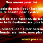 Mon amour, tu es toute ma vie. Chaque jour est un jour de bonheur en plus à tes côtés, un jour pour lequel aujourd’hui, je prends l’occasion de te dire merci. Si je vais mal tu es toujours la tu me laisse pas ! Tu essaye de me faire sourire ou me faire oublier ma tristesse j’ouvre ma main et je vois cette étoile qui s’envole et qui me fait comprendre que tu serras toujours la pour moi. J’avais tout cassé, tout brûlé, tout oublié, pour que tu puisses enfin me remarquer, mais, tu ne voulais pas savoir la douleur que j’éprouvais, je t’aime comme pas possible.