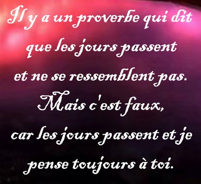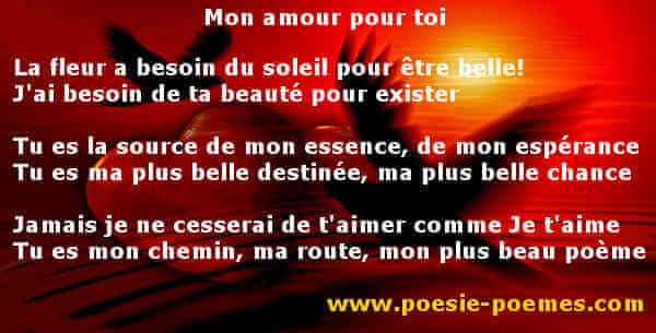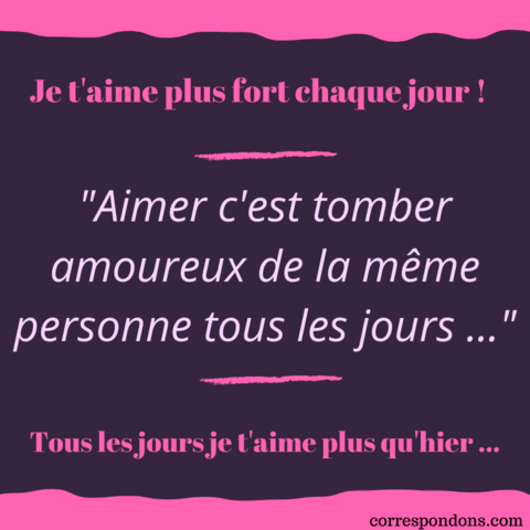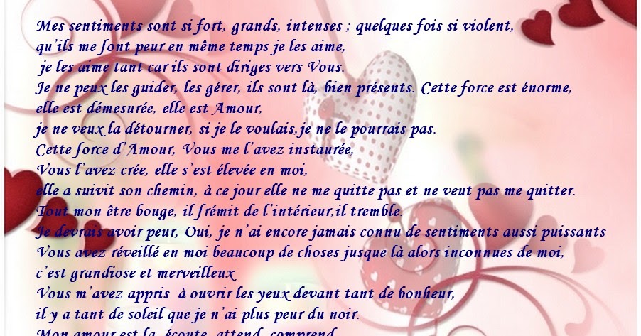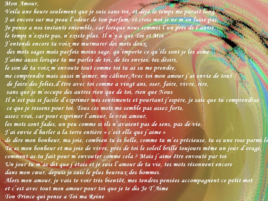 Texte d’amour pour lui, texte d’amour pour elle C’est seulement quand on risque de perdre une personne qu’on se rend compte à quel point on y tient, à quel point on en a besoin et à quel point on l’aime. Je te donnerai ma vie si je le devais. Je te donnerai mon âme si je le pouvais. Je te donnerais mon coeur même si c’est déjà fais. Je te donnerai ma présence même en cas d’absence je te donnerai mon amour un peu plus chaque jour. Mon amour, tu es toute ma vie. Chaque jour est un jour de bonheur en plus à tes côtés, un jour pour lequel aujourd’hui, je prends l’occasion de te dire merci. Si je vais mal tu es toujours la tu me laisse pas !