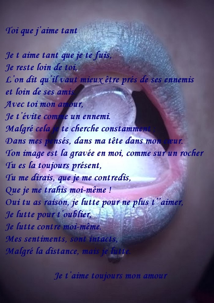 Mon amour, tu es toute ma vie. Chaque jour est un jour de bonheur en plus à tes côtés, un jour pour lequel aujourd’hui, je prends l’occasion de te dire merci. Si je vais mal tu es toujours la tu me laisse pas ! Tu essaye de me faire sourire ou me faire oublier ma tristesse j’ouvre ma main et je vois cette étoile qui s’envole et qui me fait comprendre que tu serras toujours la pour moi. J’avais tout cassé, tout brûlé, tout oublié, pour que tu puisses enfin me remarquer, mais, tu ne voulais pas savoir la douleur que j’éprouvais, je t’aime comme pas possible.