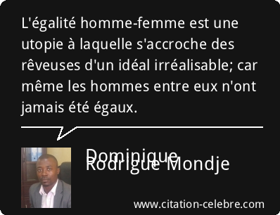 Citation de Félicité Robert de Lamennais ; Le livre du peuple (1838) Un homme ne se met guère aux pieds d’une femme que pour la mettre sous ses mains. Citation de Edmond Thiaudière ; La soif du juste (1895) La coquetterie est le fait des femmes et l’œuvre des hommes. Citation de Eugène Marbeau ; Les remarques et pensées (1901) Homme et femme, chacun est complémentaire de l’autre. Citation de Gandhi ; Tous les hommes sont frères (1969) À femme peu commode, tout homme s’accommode. Citation de Axel Oxenstiern ; Les réflexions sur les femmes (1652) La sympathie entre deux corps est d’autant plus grande que leur électricité contraire est plus prononcée. Il en est, tel que le potassium et l’oxygène, qui ne peuvent être mis en contact sans s’unir immédiatement.