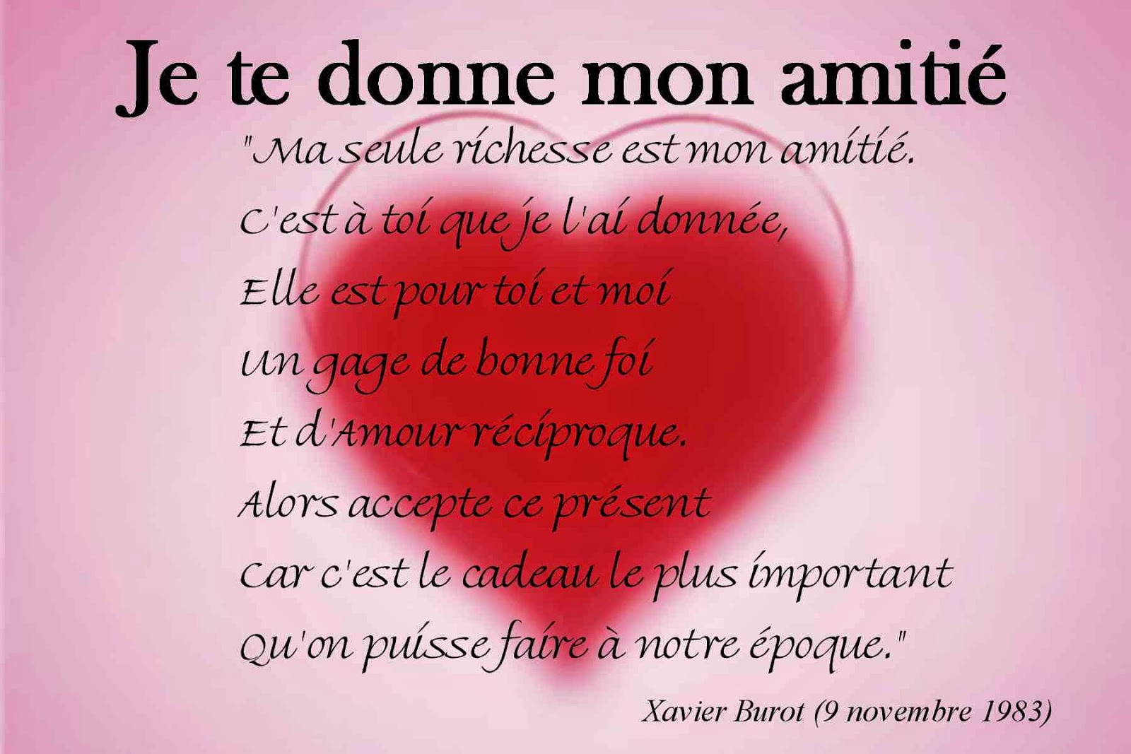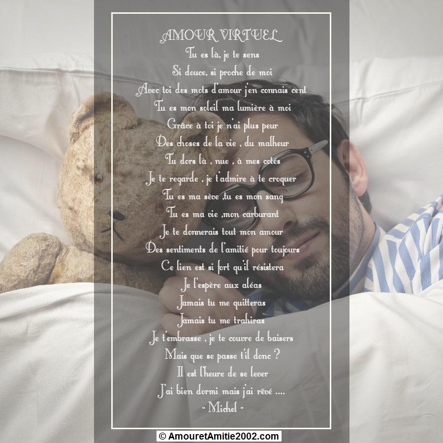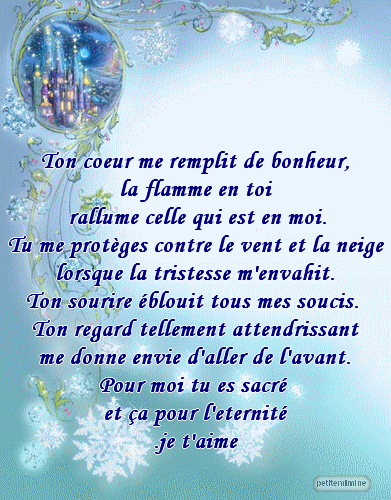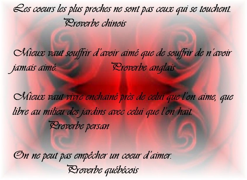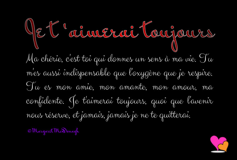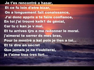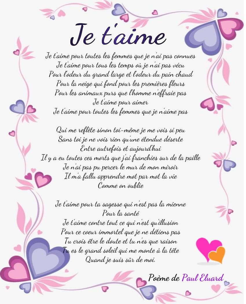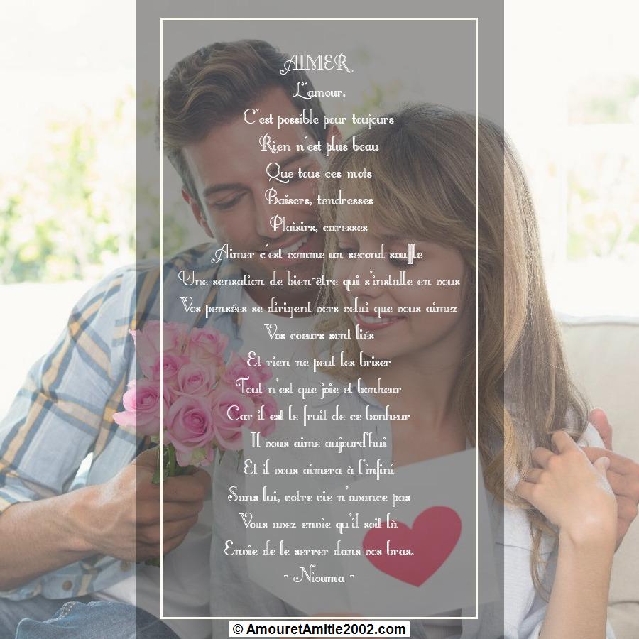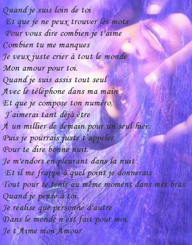 Poème d’amour: Mon amour pour toujours Mon amour tu sais que je t’aime Je ne pense qu’à toi, tous les jours Et je rêve de toi, toutes les nuits Mon amour au cœur aussi généreux Plein d’amour et de douceurs pour moi Tu me donnes le bonheur et la joie Mon cœur a chaviré pour toi Dès la première fois que je t’ai vu Mon amour tu es exceptionnel Je ferai tout pour toi Je ne te quitterai jamais Parce que je t’attendais Je t’attendais depuis toujours Et maintenant que je t’ai trouvé Je te garderai pour toujours. Poème d’amour triste Qu’est-ce qu’il m’arrive ? Se demande la fille en pleur Pourquoi tu me garde prisonnière, après tous ces chagrins Pour me faire souffrir et détruire mon sourire Pour me faire pleurer en déplorant mon sort Les flammes qui grandissent au fond de mon cœur Ne s’éteindront qu’après la mort de mon amour Amour, tu me feras souffrir jusqu’à la fin de mes jours.