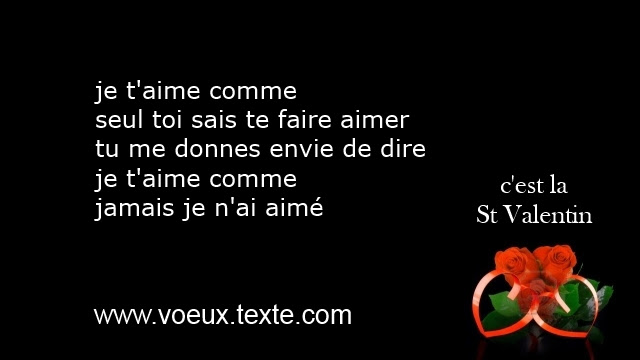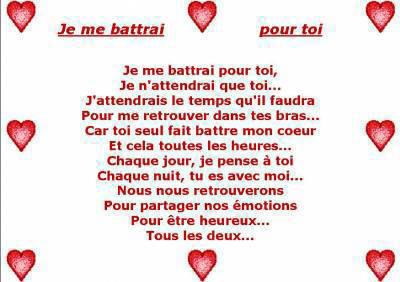 Toi mon amour, tu es mon trésor, Je t’aime toi et toi seul, Ton amour est plus précieux que l’or, Je pense à toi sans cesse. Partout ou que je j’aie, Tu es présente dans mon cœur Et toutes les choses que je fais, Ne sont que pour toi mon amour. Mon admiration pour toi est énorme, Que les mots ne suffisent pas pour le dire, Un amour si grand, Que même dire « Je t’aime » paraît rien. Je t’aime à en mourir, Comme je n’ai jamais aimé personne, Je t’aime pour la vie, Et mon cœur, je te l’offre. Poème d’amour : Tu as conquis mon coeur.