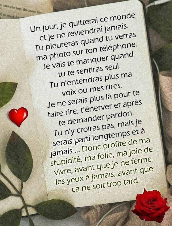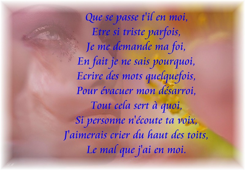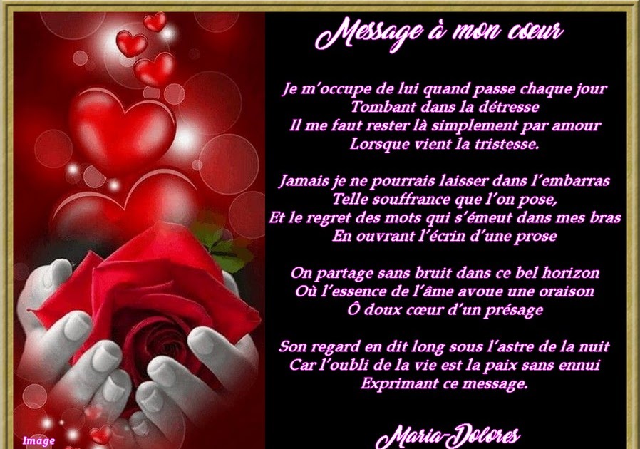 Quand je suis avec toi, ma vie devient plus belle, Malgré les tournant de la vie, je souris quand même, Dès que tu me prends la main, tout va pour le mieux. Par ta tendresse et tes baisers et tes caresses passionné, Tu as effacé toutes mes souffrances et ensorcelé mon cœur, Tu as ranimé en moi l’espérance au bonheur et à la vie. On dit que le prince charmant n’existe que dans les romans, Mais quand je te vois, je n’en crois rien, puisque c’est toi, Je suis heureuse et comblée, pour avoir la chance de t’aimer, Partagent nos vies ensemble, pour plein d’amour et de bonheur. Poème d’amour : Tu es mon plus grand amour.