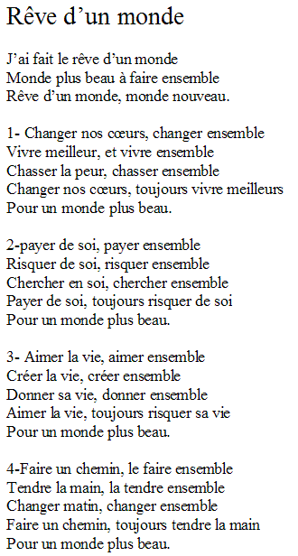 Je rêve d’un monde sans maladies Où l’on vivrait jusqu’à mille ans Sans l’angoisse d’avoir à supporter la modernité et la nouveauté. Je rêve d’un monde sans frontières, sans guerres, sans conflits, sans mélancolie, sans monotonie, sans faux amis, sans belles paroles, sans mauvaises personnes, sans sang et sans haine, sans armes. Je rêve d’un monde plein d’amour Où l’on serait tous frères Je rêve d’amour et d’amitié Je rêve d’eau fraîche et d’air pur Je rêve peut-être trop, c’est vrai Mais la foi, je l’ai perdue Alors il reste l’esprit et ses méandres, jonchées de rêves et de chimères idéalistes Qui resteront les pensées de quelqu’un qui doit accepter son sort et vivre dans le monde que les Hommes ont crée.