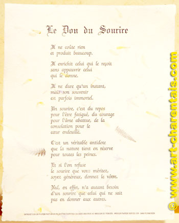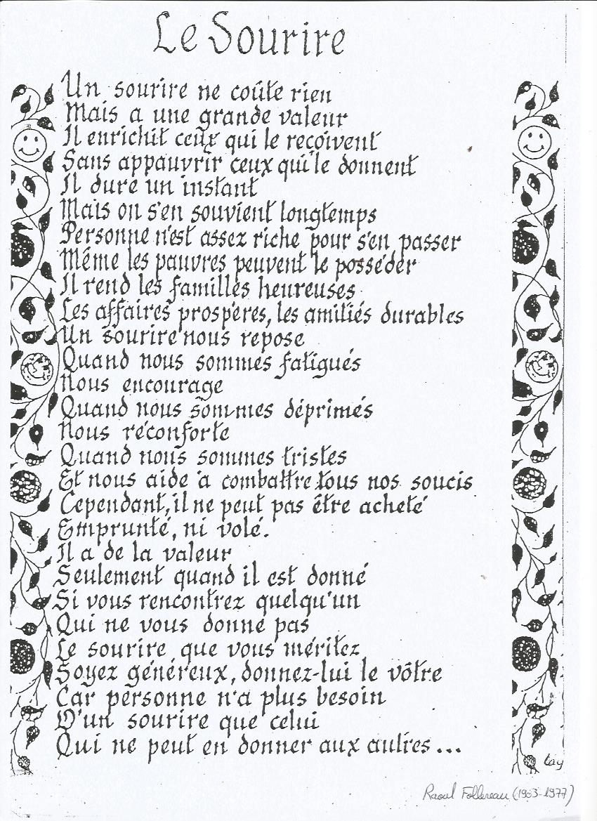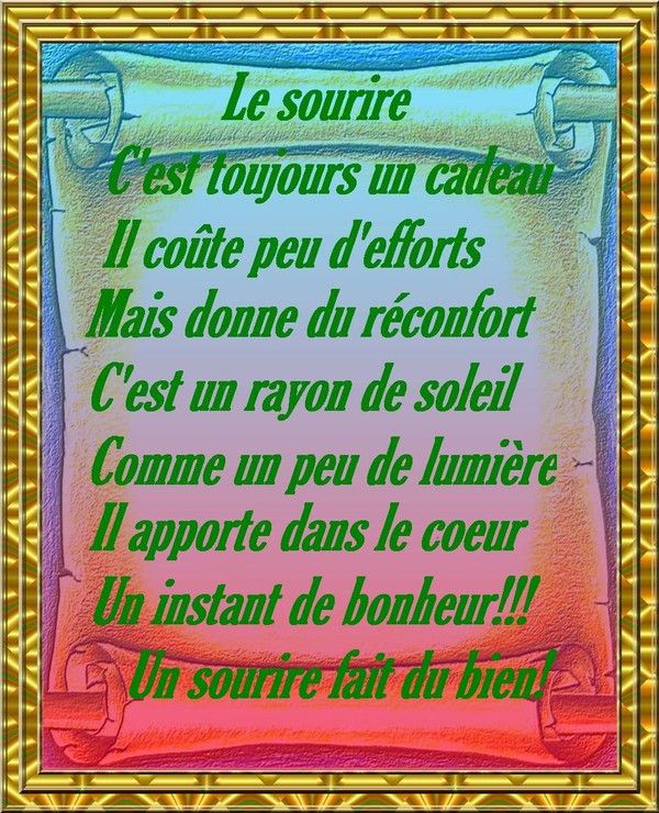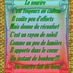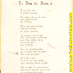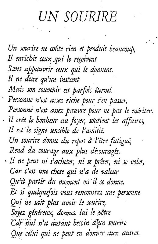 Le sourire nous repose quand nous sommes fatigués et nous encourage quand nous sommes déprimés. Le sourire nous réconforte quand nous sommes tristes et nous aide à combattre nos soucis. Le sourire ne peut être acheté ou volé et n’a de valeur que lorsqu’il est donné. Si vous rencontrez quelqu’un qui ne vous donne pas le sourire que vous méritez, soyez généreux, offrez-lui le vôtre. Car personne n’a plus besoin d’un sourire que celui qui ne peut en accorder aux autres… Auteur inconnu