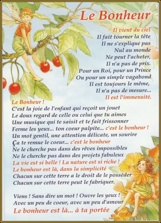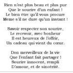 Les poèmes sur le sourire : Un sourire. Recueil : Le Livre d’amour (1920) Il enrichit celui qui le reçoit sans appauvrir celui qui le donne, Il ne dure qu’un instant, mais son souvenir est parfois éternel, Personne n’est assez riche pour s’en passer, Personne n’est assez pauvre pour ne pas le mériter, Il crée le bonheur au foyer, soutient les affaires, Il est le signe sensible de l’amitié, Un sourire donne du repos à l’être fatigué, Donne du courage au plus découragé Il ne peut ni s’acheter, ni se prêter, ni se voler, Car c’est une chose qui n’a de valeur qu’à partir du moment où il se donne.