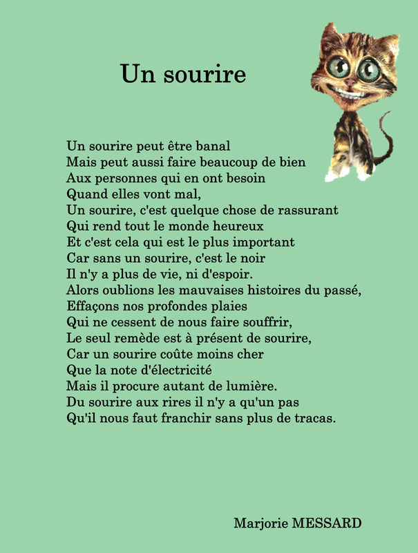 Extait de : Les échos du rivage Votre sourire est charmant de gaieté. Lorsqu’en mon âme où bout parfois l’orage, il resplendit comme un soleil d’été, il y dissipe et chasse tout nuage. Et je m’apaise à sa sérénité. Albert Dabadie Juste un sourire Souriez aux personnes qui croisent votre route Sans raison aucune, sans malice et sans doute. Souriez toujours à la vie. Elle vous paraîtra plus jolie. Souriez aussi à ceux que vous aimez. Ils se sentiront plus légers. Et si l’on vous rend votre sourire, vous vous sentirez mieux. Un sourire sans fard est un coin de ciel bleu. Si le sourire était une maladie Je voudrais qu’il se répande tel une épidémie. Un sourire ne vous coûte rien Mais il peut faire beaucoup de bien.