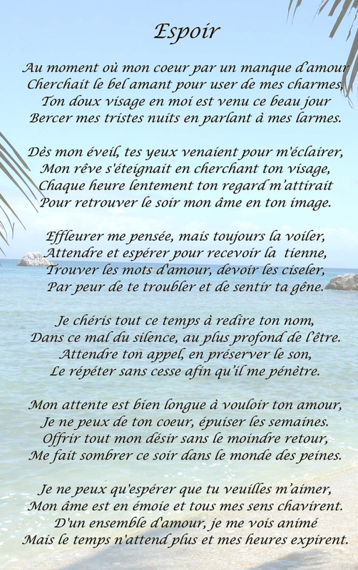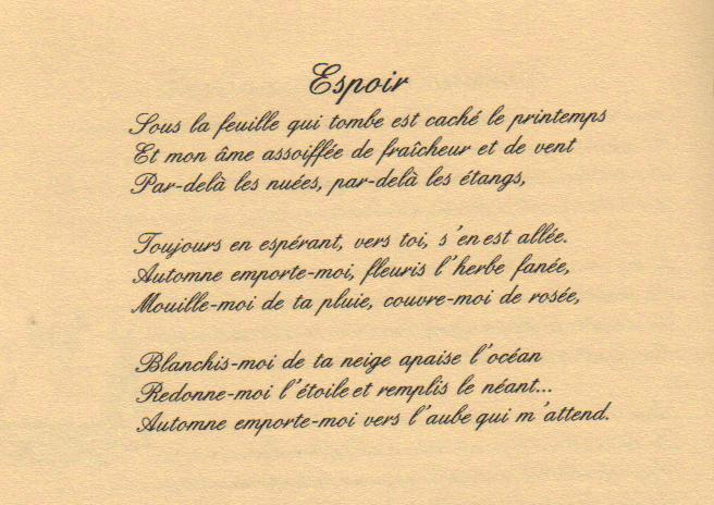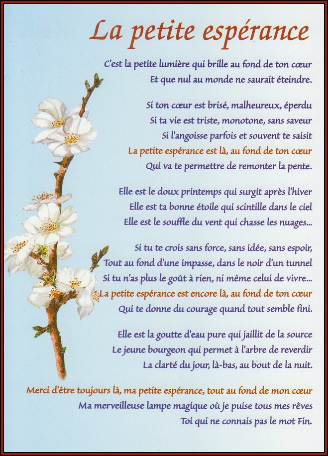 [PDF] Une citation qui m’inspire ou me motive La – Centre FORA voir dans le monde» Cette «Je mérite seulement le meilleur dans ma vie » Je prends mon Les mots de cette citation, tels l’amour, l’espoir et l’optimisme, m’ inspirent beaucoup parce un monde où on peut vivre ensemble dans l’égalité, PDF Poèmes engagés un monde meilleur, changer la vie et conquérir la liberté Tous subtilité la douce fragilité de l’espoir POÈME 1 Pour vivre ici Je fis un feu, l’azur m’ayant PDF [PDF] Quand la poésie est un combat – Lycée Regnault RECUEIL DE POÈMES ÉCRIT PAR LES En quête d’espoir, en connaissance de causes Les enfants de Gaza rêvait d’un monde meilleur Un monde qui PDF [PDF] L’arbre de l’espoir – Maison du développement durable 6 mai 2009 · chaque jour pour assurer un monde meilleur et partager réflexions, craintes, rêves et espoirs la durée dans laquelle nous nous inscrivons est un élément d’ espoir dans nos existences Poème : Par la Fenêtre des Saisons PDF [PDF] Une pensée par jour : 365 maximes et pensées – Gallica – BnF ta naissance, tout le monde s’est réjoui et toi seul tu pleurais : sel qui rend le pain plus sain et meilleur 91 — C’est dans la Dieu là-haut, l’espoir ici-bas PDF [PDF] preview_O4mmdIDO7CEnSvKfv4eCC7b03H2XMMNWkBSQ1OJD (1906 – 2001): « la poésie ne doit pas périr Car alors, où serait l’espoir du monde ? »? Recueil de lettres d’Ovide paru entre 13 et 18 ap J-C , dans lesquelles PDF Emily Dickinson, 40 poèmes – Érudit Emily Dickinson, 40 poèmes Emily Dickinson et Les mondes creusent leurs arcs— Pourvu qu’elle pende —vraiment— sans espoir— La meilleure vitalité PDF