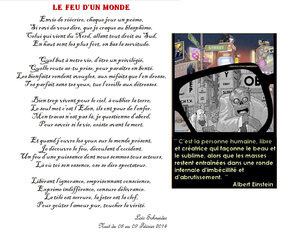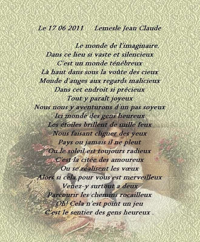 Je t’embrasse bien fort Pierre vivre sans espoir, c’est cesser de vivre (Dostoïevski) ode3117 Statut: Hors ligne Statistiques de l’utilisateur 639 poèmes Liste 27181 commentaires Membre depuis 22 juillet 2010 Dernière connexion 10 avril Publié: Modifié: 1er oct 2012 à 09:55 par ode3117 1er oct 2012 à 09:51 Citer RABAB puisses – tu dire vrai, ……..Un monde meilleur, , ton poème est un véritable cri d’espoir, que la colombe soit notre plus belle image, et qu’aucune balle ne vienne la blesser……Et que tous les maîtres du monde entendent notre appel…..Comme dans la superbe chanson de Michèle TORR ( j’en appelle à la tendresse ) Bises amicales ODE 31 – 17 OM songe d’un jour Statut: Hors ligne Statistiques de l’utilisateur 19 poèmes Liste 196 commentaires Membre depuis 11 février 2011 Dernière connexion 30 décembre 2020 Publié: 2 oct 2012 à 08:04 Citer Connaîtrons nous un jour la paix en ce monde?. Oui sans aucun doute car tous les rêves deviennent un jour réalité. Mais je crois aussi que le chemin sera long pour arriver à cette finalité.