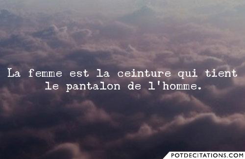 Proverbe français ; Les meilleurs proverbes français (1864) La femme est un talisman en feuille de rônier. Proverbe sénégalais ; Les proverbes joola de Casamance (1998) Le monde change de jour en jour, la femme de minute en minute. Proverbe juif ; Les proverbes et dictons juifs (1962) Femme sans moralité, repas sans sel. Proverbe juif ; Les proverbes et dictons juifs (1962) La maison d’un homme c’est sa femme. Proverbe hébreu ; Le Talmud, Yoma – Ve siècle. La femme est le jugement dernier de l’homme. Proverbe danois ; Les proverbes et dictons scandinaves (1960) Une maison sans femme est une prairie sans rosée. Proverbe alsacien ; Les proverbes et dictons alsaciens (1980) Dans la femme des autres, le diable met une cuillerée de miel.