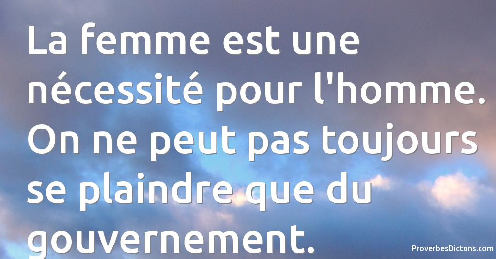 Les proverbes et adages sur la femme Les 89 proverbes, adages et dictons sur femme : Une femme qui pleure toujours deviendra à la longue aveugle. Proverbe syrien ; Les proverbes et dictons de la province de Syrie (1883) Qui a femme et enfants leur doit aussi de l’agrément. Proverbe breton ; Les proverbes et dictons de la Basse-Bretagne (1878) La femme, l’argent et le vin, ont leurs vertus et leur venin. Proverbe breton ; Les proverbes et dictons de la Basse-Bretagne (1878) La femme qui travaille à la maison ne fait pas souvent parler d’elle. Proverbe breton ; Les proverbes et dictons de la Basse-Bretagne (1878) Si la femme était bonne, Dieu en aurait une.